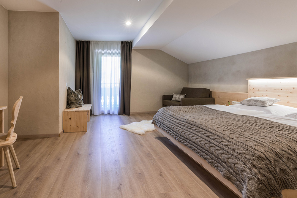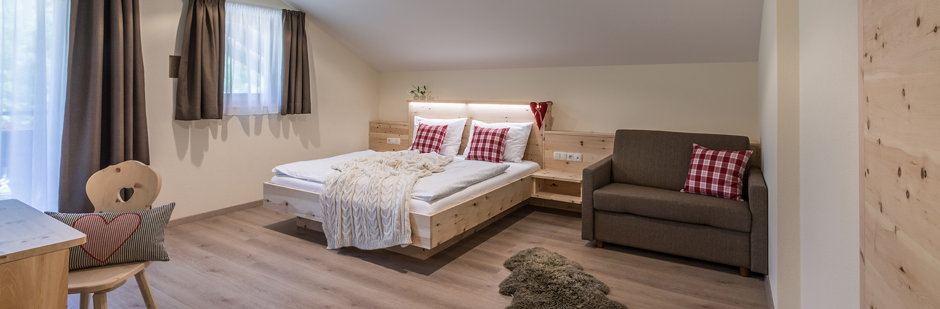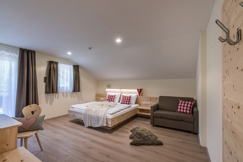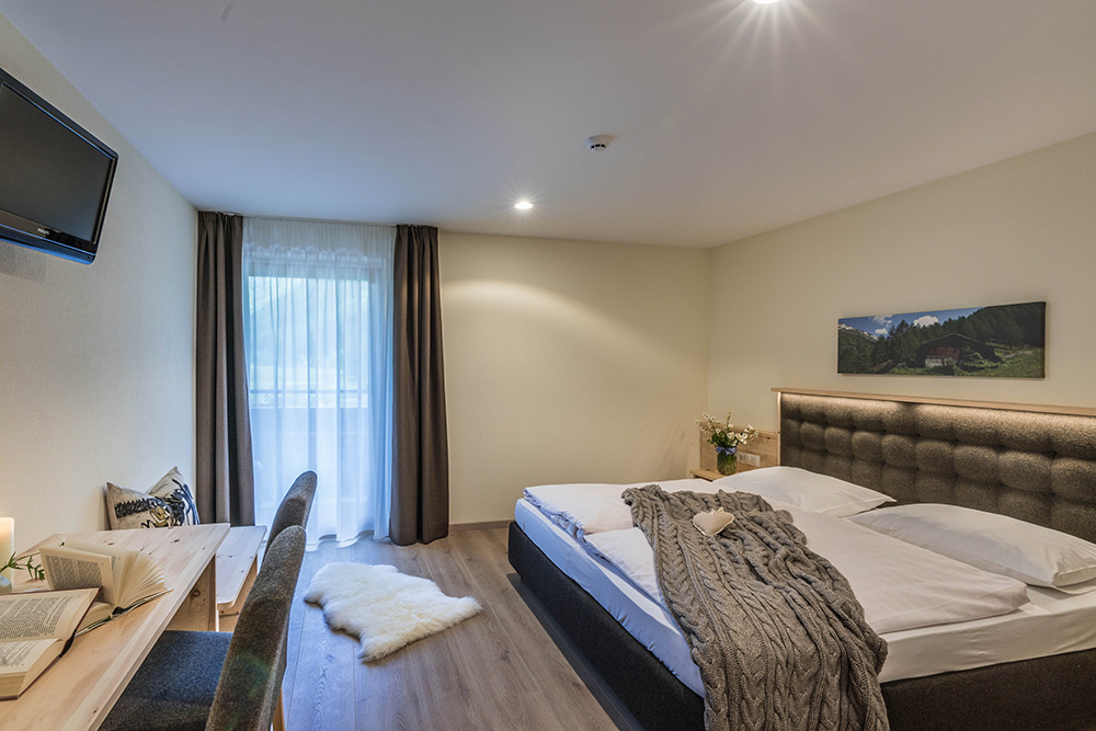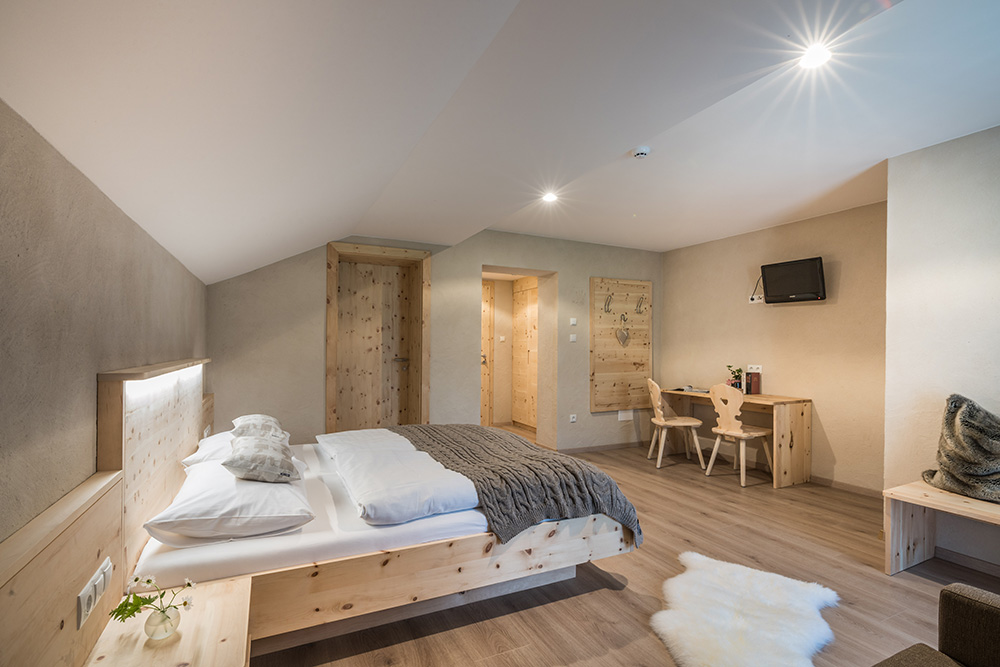 Unsere 13 Superior Zimmer Zirm (ca. 25-30 m²) bieten Platz für 2-3 Personen und sind mit moderner Einrichtung aus hochwertigem Zirmholz ausgestattet. Unsere Zimmer verfügen über: